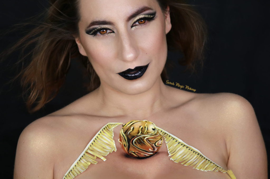 Note : I wanted to add something a little bit surreal and magical to my makeup so I made the Golden Snitch’s wings with paper, painted them and glued them to the painting on my chest. Then I used a hair dryer to make them flutter 🙂